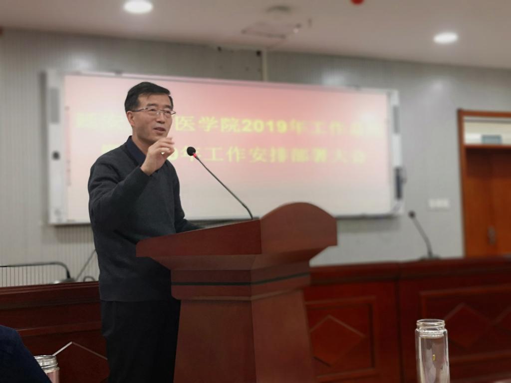 韩继明院长作了题为《不忘初心团结奋进新时代,牢记使命凝心聚力写新篇》的报告,从九个方面对医学院2019年重点工作进行了回顾,他在报告中指出,2019年,学院的各项工作取得了一定的成绩,但也存在一些困难和问题,学院将继续深化医教协同进一步推进医学教育改革与发展,迎接教育部临床专业认证的攻坚期,全院干部职工凝心聚力,团结奋斗,扎实工作,打赢临床医学专业认证这次攻坚战。