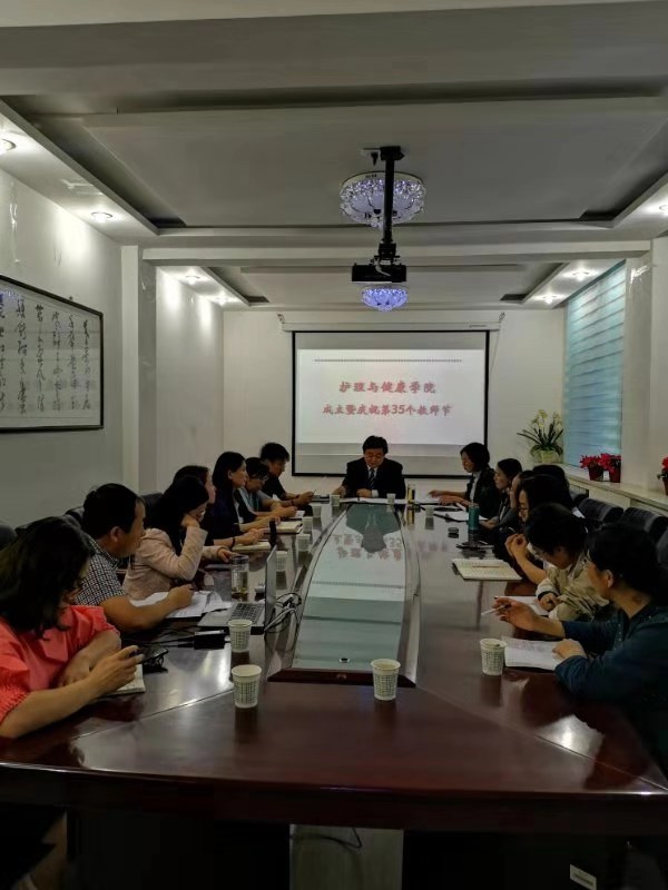 护理与健康学院成立暨庆祝第35个教师节座谈会在学院行政楼一楼会议室举行。学院院长韩继明、副院长刘晓斌、副院长兼基础医学院院长杨彦玲及护理与健康学院所有教职工参加会议。会议由韩继明院长主持。
