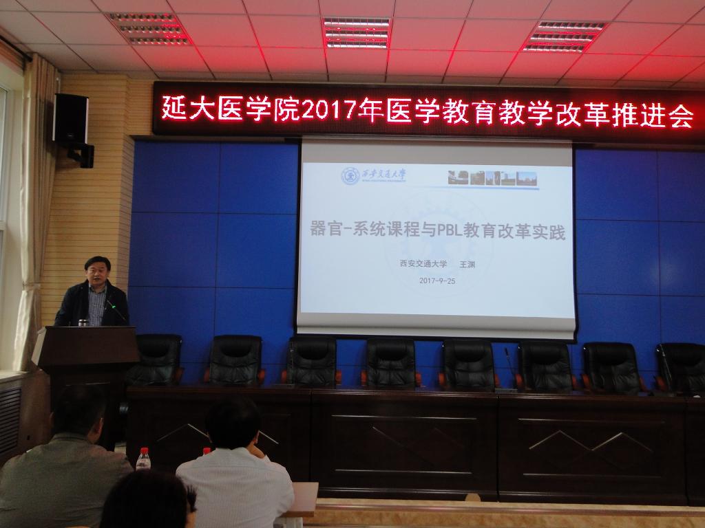 为了贯彻落实“十八大”以来医教协同改革文件精神,推进健康中国建设工作,结合临床医学专业认证工作,医学院启动了2017年医学教育教学改革推进工作。9月25日,医学院邀请西安交通大学医学部人才培养处本科部教学主任(主管)王渊作“器官—系统课程与PBL教育改革实践”的学术报告,教务处副处长王文东、附属医院副院长李红梅、延安市人民医院科教科科长张晓燕及附属医院、延安市人民医院各教研室主任和医学院全体教师参加了会议。会议由韩继明院长主持。