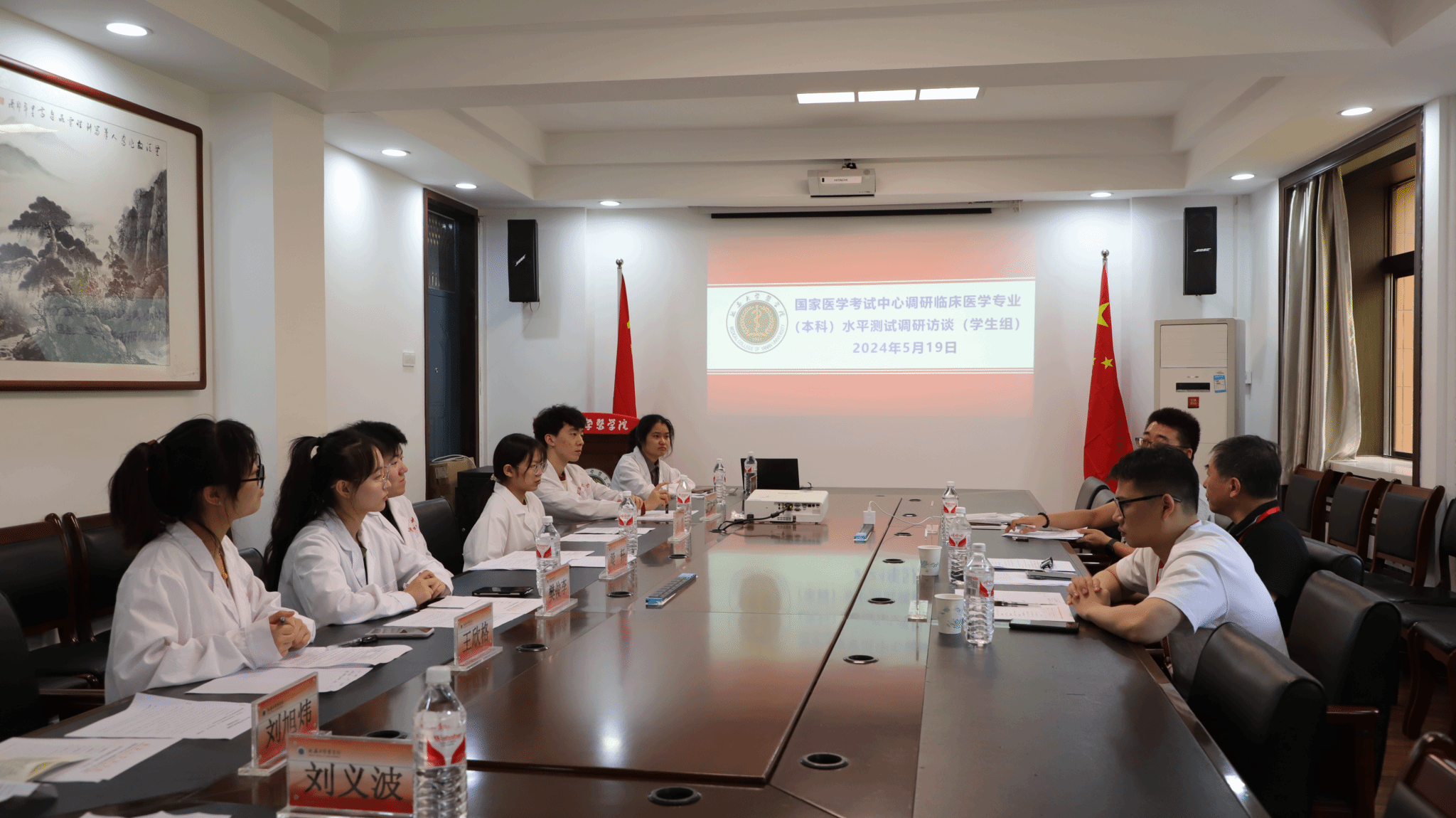 走访结束后举行了专题调研访谈会,分教师组和学生组两场举行。刘晓斌对专家组的到来表示欢迎,简要介绍了我校医学院基本办学情况,着重汇报了我校为落实国务院医教协同有关文件精神,加强医学人才培养,提高医疗卫生服务水平的具体做法及成效,并指出临床医学专业水平测试是对医学生的“摸底检查”,不仅能让学生对个人的理论知识、实践掌握水平有所了解,也能让教师及时做出教学调整,优化专业人才培养方案,这对于培养高素质医学人才具有重要意义。国家医学考试中心干部朱钊良反馈了巡考情况,对学校考试组织情况给予了充分肯定,并高度评价了临床基本技能考试的规范性。