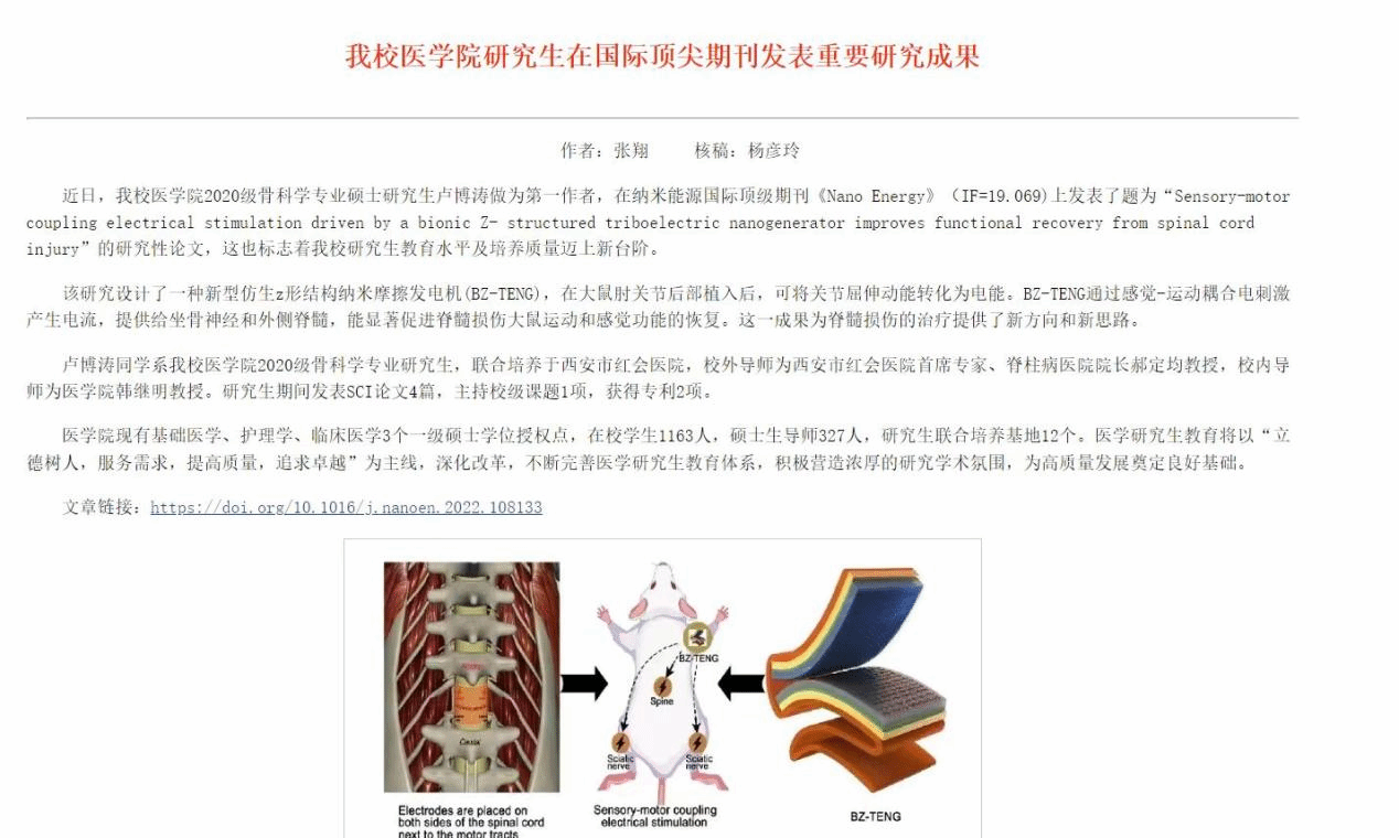 学子在国内重大竞赛和创先争优活动中再创佳绩。冯禧轩在首届人体解剖学教学模型创新设计大赛获得第一名(指导老师:王璐);张欣团队(指导老师:杨彦玲、刘晓龙)、李振豪团队(指导老师:吕玉红)、梁薛峰团队(指导老师:阮彩莲、王璐)喜获第九届全国大学生基础医学创新研究暨实验设计大赛铜奖;杨佳乐团队(指导老师:岳昌武、吕玉红)获得第八届全国大学生基础医学创新研究暨实验设计论坛全国总决赛金奖;苏夏雨团队(指导老师:岳昌武、吕玉红)荣获 “互联网+”大赛国家级铜奖;神经生物学团队贺广祥、王林(指导教师:杨彦玲)研究成果荣获陕西省研究生创新成果奖三等奖。2023年91短视频