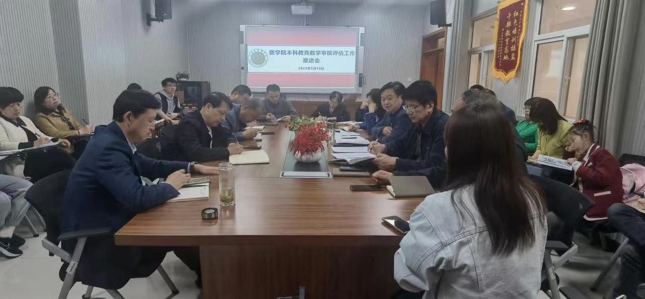 在泽东干部学院第四会议室召开医学院本科教育教学审核评估推进会,医学院全体处级领导、教研室主任、教学秘书等相关人员参会。会议由院长韩继明主持。
