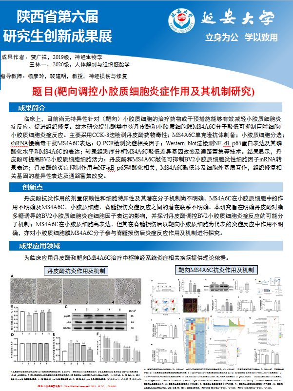 杨彦玲教授和空军军医大学裴建明教授,该论文主要采用中药丹皮酚和靶向敲低小胶质细胞膜MS4A6C调控小胶质细胞炎症作用并探究其机制。基础医学院研究生首次荣获陕西省研究生创新成果奖,彰显了91短视频