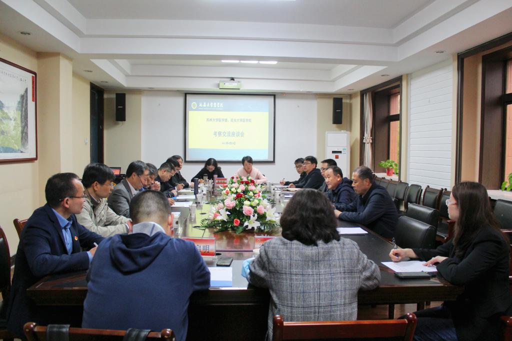 的基本情况作了简单介绍。随后,葛彬书记详细介绍了我校坚持用延安精神办学育人,依托红色文化资源优势,以延安精神教育为抓手,探索构建了延安精神“一体两翼”育人体系及显著育人效果。他指出,苏州大学医学部是全国医学教育的一面旗帜,两院在人才培养等方面具有广阔的合作空间。他希望以此考察交流为契机,推动两院更加紧密的合作。