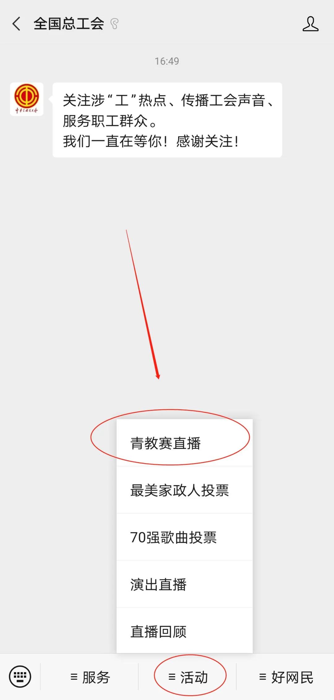 2.关注全国总工会微信公众号,从“活动-青教赛直播”菜单进入。