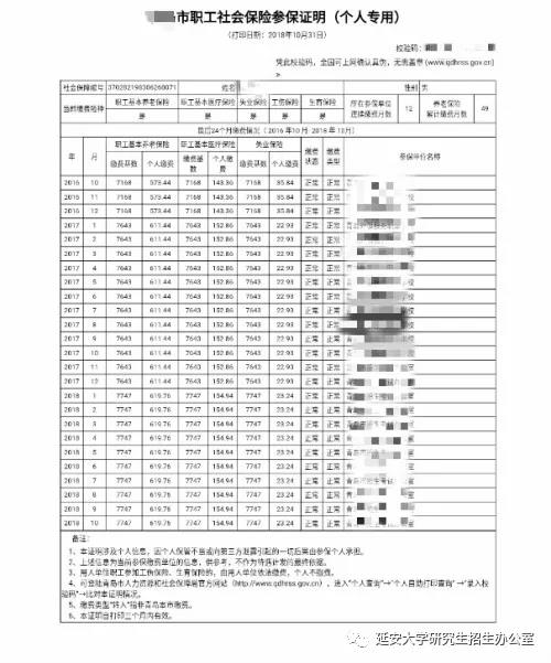 (3)在延安近三个月缴费的社保证明或人社局网站打印的用人单位为其缴纳的社保截图(缴费单位名称应与工作单位一致,如不一致,需劳动合同中用人单位出具说明解释原因;社保缴费证明须加盖社保经办机构公章)。示范照片如下: