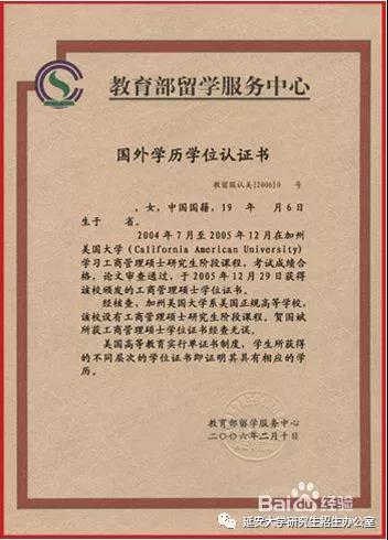 5.在境外获得学历证书的考生除上述对应类别应该提交的材料外还须上传教育部留学服务中心出具的《国外学历学位认证书》原件。示范照片如下: