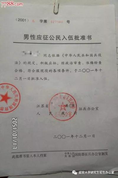 6.报考“退役大学生士兵专项硕士研究生招生计划”的考生除上述1~4对应类别应该提交的材料外,还须上传本人《入伍批准书》和《退出现役证》原件。示范照片如下: