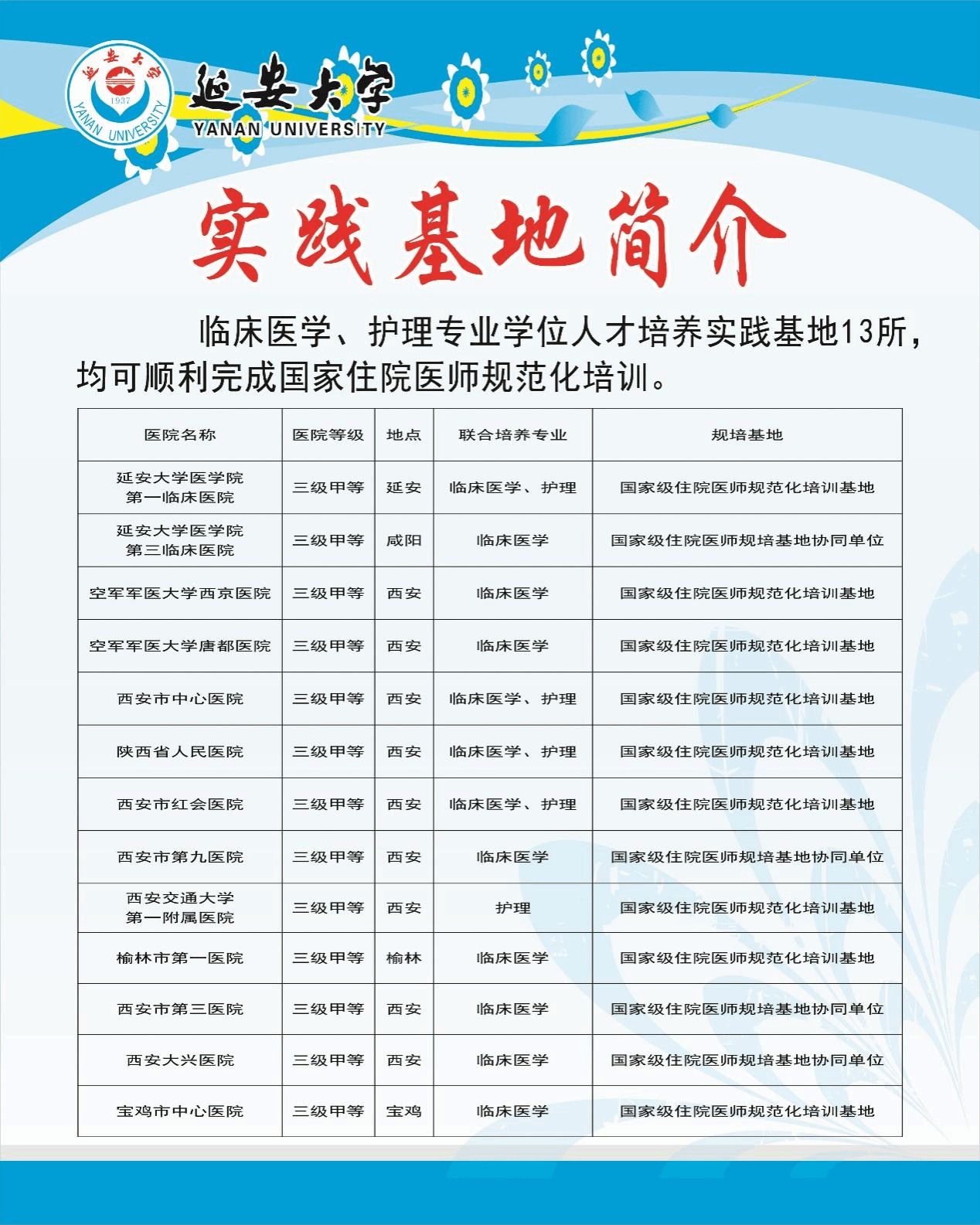 医学院第三临床医院、空军军医大学西京医院、空军军医大学唐都医院、西安交通大学第一附属医院、陕西省人民医院、西安市红会医院、西安市中心医院、榆林市第一医院、西安市第九医院、西安市第三医院、西安大兴医院、宝鸡市中心医院等,已建立了成熟的“院校共育”培养模式,采取“双导师制”教学模式,建有健全的实践基地管理体系和运行机制,教学成果显著,均可完成国家住院医师规范化培训。