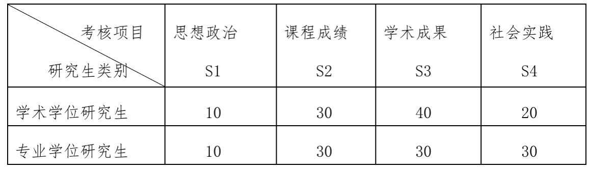 学术学位研究生学业奖学金评选采用计分制,满分100分,总分中思想政治S1占10%,课程成绩S2占30%,学术成果S3占40%,社会实践活动S4占20%。