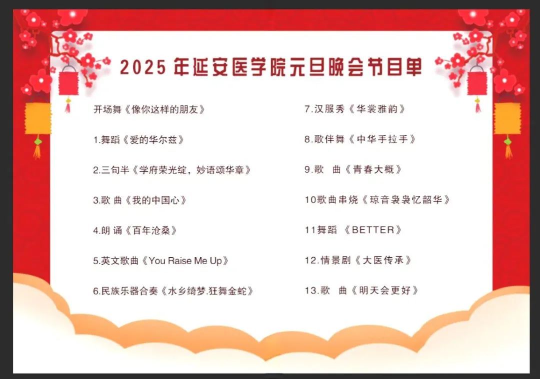 旧岁已展千重锦,新年再进百尺竿。晚会虽已经落下帷幕,但那些欢歌笑语、那些精彩瞬间,将永远留在我们心中。回首过去的一年,全体延医人如逐梦星辰的行者,在医学长河留下了奋斗的足迹。在新的一年里,我们怀揣憧憬,眺望未来,祝愿全体延医人在勇攀医学高峰的道路上笃定前行,再创辉煌!祝全体师生元旦快乐,万事胜意!