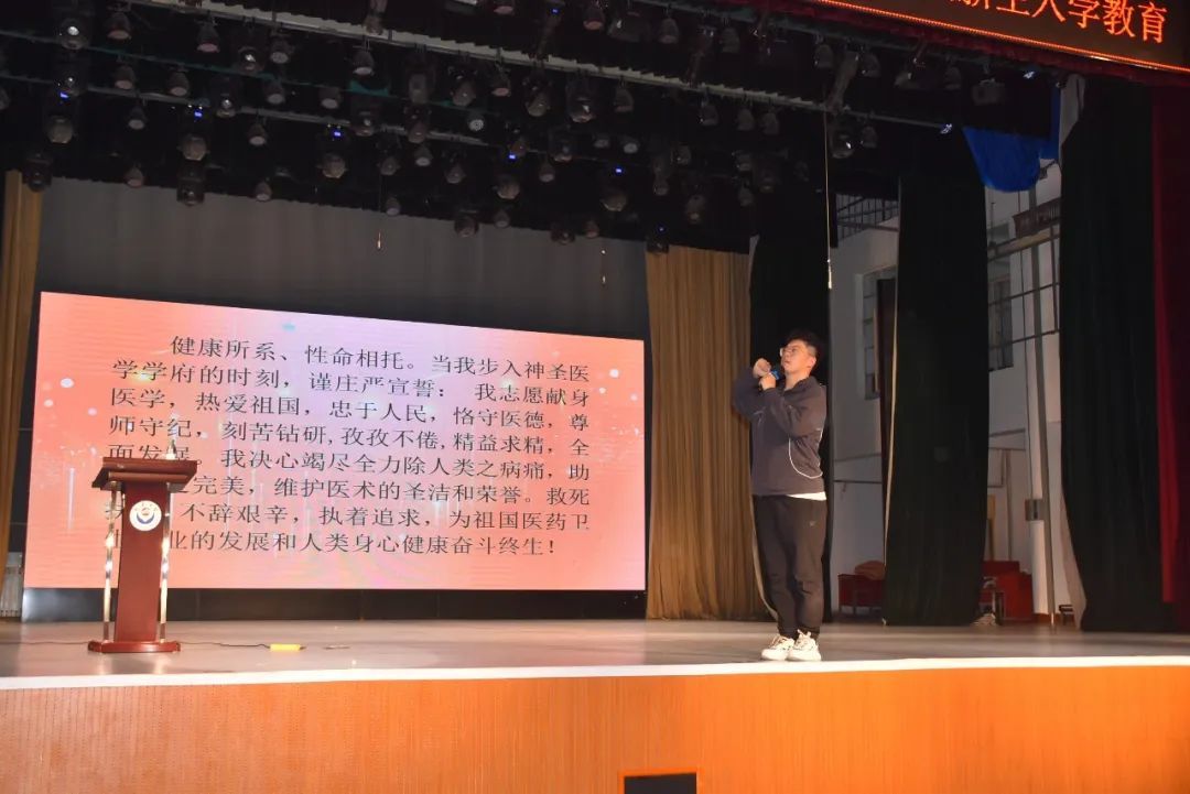 随后,新生们进入了一个庄严而神圣的仪式——医学生宣誓。在肃穆的氛围中,全体新生齐声诵读医学生誓言。那一句句铿锵有力的誓词,不仅是对医学职业的庄严承诺,更是对生命的尊重,它激励着每一位新生在未来的医学道路上前行。