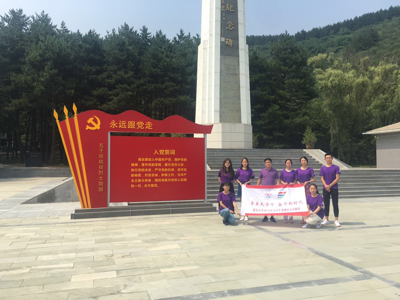 7月23日,医学院三下乡暑期社会实践团怀揣着对革命先烈的敬仰与缅怀之情,来到了黄龙县瓦子街战役烈士陵园,开展“追忆先辈足迹 做新时代先锋”三下乡暑期社会实践活动,去寻找革命先烈的足迹,感悟今天的幸福生活。瓦子街战役烈士陵园,坐落于陕西省黄龙县瓦子街镇,是为了纪念解放战争时期西北战场上著名的瓦子街战役中阵亡的革命英烈而修建的,始建于1949年4月4日,园内安葬着在宜瓦战役中牺牲的报考714团团长任世鸿、参谋长武治安在内的5287名烈士的遗骨,是“陕西省重点烈士纪念建筑物保护单位”、“陕西省爱国主义教育基地”。1981年4月首次对陵园进行了较大规模的扩建和维修,新修烈士纪念碑一座,修建了围墙等基本设施,扩建后占地24亩。碑座为正方形,四面有八级台阶,象征1948年;碑身为两个断面,象征2月;碑身高28米,象征28日,正面题刻王震同志题词:“瓦子街战役烈士纪念碑”。