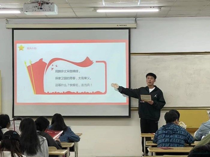 退伍复学军人刘开聪在影像22-1和影像22-2班进行征兵政策宣讲和部队生活感悟分享