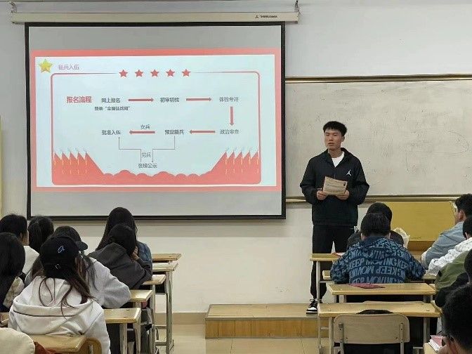 退伍复学军人杨维州在检验22和护理22班进行征兵政策宣讲和部队生活感悟分享